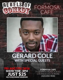It's Rebels of Comedy at the Formosa Cafe in West Hollywood. Come out and see a night of live comedy, featuring an awesome lineup of professional features and headliner comedians.