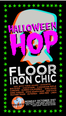 Halloween Hop! October 31st @ Preserve Athens GA FLOOR IRON CHIC OFF WITH THEIR HEADS BIG EYES VACATION SHELLSHAG CANADIAN RIFLE OWTH ACOUSTIC CANCERS STEVE ADAMYK SONIC AVENUES