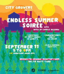 Join us on Sunday, September 11th at the Brooklyn Grange Rooftop Farm to celebrate the changing of seasons, and cheers to our 5th year of teaching young New Yorkers where food comes from and why it matters. Spend an afternoon wandering among sunflowers and enjoying the view of the Manhattan skyline, while snacking on bites created by Chef Camille Becerra, sipping cocktails crafted by Arley Marks (Bev. Director of Honeys), and enjoying an exclusive taste of the City Growers & Morgenstern's Finest Ice Cream collaboration - one of the flavors features papalo grown at the Brooklyn Grange!