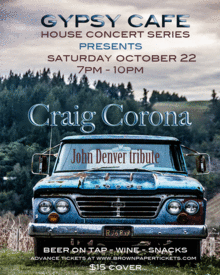 Accomplished guitarist and Americana singer / songwriter Craig Corona, performs 2 hours of John Denver classics. Enjoy an evening of music at the Gypsy Cafe, with beer, wine and snacks available.