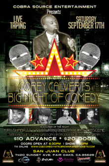 September 17th Cobra Source Entertainment and the San Juan Club. Proudly welcomes back to the stage comedian Corey K. Calvert and his stand up comedy show " Night Of Comedy." Corey K. Calvert is one of hottest comics from Chi-town. Corey, has been making noise up & down the California coast line leaving a lasting impression on every audience he encounters. Keeping the crowd laughing with his funny crazy humor.