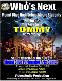 STM Entertainment, a Budd Lake NJ based entertainment agency, in cooperation with the Mount Olive Board of Education, is proud to present "TOMMY - THE ROCK OPERA" performed by WHO'S NEXT- the ultimate Who tribute band and specials guests from the Mt. Olive High School Music and Media Production students.