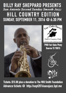 BillyRay Sheppard and San Antonio's finest musicians head for the Hill Country for this edition of his Second Sunday Smooth Jazz Series. The beautiful Fair Oaks Golf and Country Club is the backdrop for the September concert. As always this is a party with a purpose. Patrons are asked to bring a donation to benefit the Will Smith Foundation. The Will Smith Foundation is not connected to the actor Will Smith. The Will Smith Foundation gives donations to 501c3 children's charities in Texas, Hawaii and Africa.