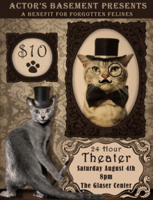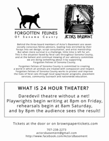 Behind the three board members of Actor's Basement are seven socially conscious feline advisors, leading lives enriched by their forays into set design, script consultation, and artist mentorship. But when mere survival is a challenge, little time is left for art. This is the situation faced by feral cats throughout Sonoma County, and at the behest and continual mewing of our advisory committee we are doing something about it by supporting Forgotten Felines of Sonoma County.