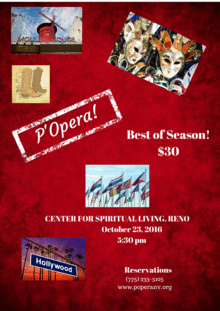 Plan now to join P'Opera! in concert as they present "Best of Season" at the Center for Spiritual Living, Reno. Featuring the best offerings from their 2016 Season, the evening will include both ensemble pieces and solo/duets. Upbeat, fun and sure to please, the "Best of Season" concert is for the whole family.