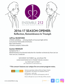 Ensemble 212 Season Opener presenting the New York premiere of Mumford's cello concerto with Christine Lamprea and the World premiere of Yoon Jae Lee's orchestral reduction of Mahler Symphony No. 5.