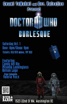 Take a peek behind the blue door and into the tempting and sexy world of Dr.Who-lesque. We have gathered the sexiest, deadliest and most favorite characters from the world of Dr.Who and are ready to make your sonic screw driver rise to the occasion.Join Swami Yomahmi as he guides you through the galaxy with his odd assortment of beauties he has gathered throughout the time/space continuum. Joining us for this evening of Whovian adventures is the magical Nelson Lugo from NYC, the sweetest of sweets, Candy del Rio, the marvelous Miranda Lookinglass, the vivacious Valeria Voxx and the irreverent Reverend Valentine! Get your tickets sooner than later and watch out for those pesky Daleks!