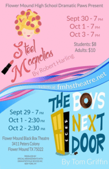 Flower Mound High School Dramatic Paws Present: "Steel Magnolias" by Robert Harling in the Flower Mound Black Box Theatre. Seating is limited! Get your tickets today!