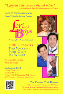 LORI AND THE BOYS returns by popular demand following a Sold-Out engagement in May! Cabaret Artist LORI DONATO, and the Equally-Artistic "Boys" TOD MACOFSKY, PERRY OJEDA, and JAY WINGER, take you on a Saucy romp through Lori's journey into the world of Friends, Music, Piano Bars, and "Arrangements While-U-Wait". Devised and Directed by ROB BOWERS and presented by his GANG O'FOUR PRODUCTIONS, this wonderful Cabertainment has been called "A joyous ride no one should miss!", "75 minutes of pure entertainment", and "One of the few cabaret acts which lives up to its hype -- and then some!". Featuring the words and music of over 50 lyricists and composers in new arrangements with "Wonderful four-part harmonies", you will enjoy everything from Solos to Company Numbers, Pop Hits to American Standards, Comic Gems to Wrist-Slitter Ballads -- You'll Laugh. You'll Cry. You'll Drink Cocktails. Don't Miss It.