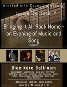 Join us for the 4th Annual "Bringing it All Back Home" concert - a celebration of homegrown talent and a special fundraiser for the Winsted Arts Council. Cabaret Setting in the Blue Note Ballroom. Silent auction and cash bar available. This year's performers include: