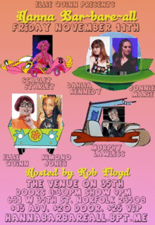 Zoinks! Jinkies! Jeepers! And the wacky beat goes onas Ellie Quinn Presents: Hanna Bar-bare-all, a burlesque tribute to the cartoons created by William Hanna and Joseph Barbera! Join us for burlesque that will have you jumping from your seat to exclaim Yabba Dabba Doo! You definitely will not want Jane to stop this crazy thing! Featuring a cast smarter than the average bear: Bonnie Marie Dahlia Kennedy Ellie Quinn Jim Dandy Murphy Lawless Scarlet Starlet