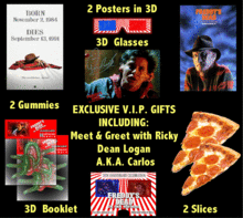 *Admission *Meet and greet session with Ricky Dean Logan including... *(1) Autograph *(1) Photograph with RDL *(2) slices of pizza *(2) Carlos's Nightmare Hearing Aid gummy candies *(1) Pair of Limited Edition Freddy's Dead 3D Glasses *(1) 3D Freddy's Dead Image Booklet *(2) 3D Posters