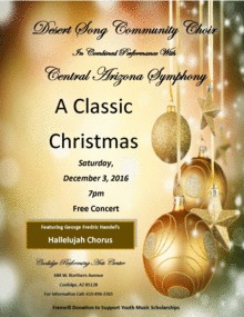 Desert Song Community Choir in Combined Performance with Central Arizona Symphony. What a wonderful opportunity to bring warmth to the Christmas Holidays with these two fine organizations sharing the stage in the Coolidge Performing Arts Center. Some music will be familiar, some new but all presented for your enjoyment. The concert will conclude with the combined Choir and Symphony presenting George Fedric Handel's Hallelujah Chorus.