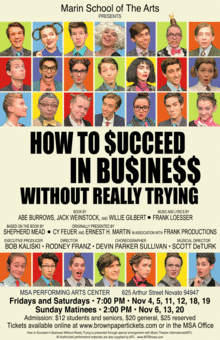 The award-winning Theatre Department of Marin School of the Arts stages the Pulitzer Prize-winning musical, How To Succeed in Business Without Really Trying directed by Rodney Franz in the Performing Arts Center at Novato High School. From the authors of Guys And Dolls comes one of the most delightful musicals of all time. Frank Loesser delivers ingenious lyrics and memorable tunes. Written in the Madmen era, the comedy satirizes big business and all it holds sacred. The show follows the rise of J. Pierrepont Finch, who uses a little handbook called "How To Succeed In Business Without Really Trying" to climb the corporate ladder from lowly window washer to high-powered executive, tackling such familiar but potent dangers as the aggressively compliant "company man," the boss' whiny, nepotistic nephew, the office party, backstabbing co-workers, caffeine addiction and, of course, true love.