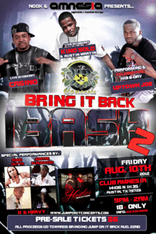 COME SEE KING SOLO + CASINO + UPTOWN JOE + RODD GUTTA + MORE ALONG WITH DJ TRULY FRIDAY AUG 10TH AT CLUB AMNESIA!!!18 AND UP ONLY! "AUSTIN WE HAVE A PROBLEM"!!! THIS WILL BE ANOTHER EPIC PARTY WITH PERFORMANCES BY THE HOTTEST ACTS IN THE CITY! COME SUPPORT BRINGING JUMP ON IT BACK WHILE HAVING A GUARANTEED MEMORABLE NIGHT! PRE-SALE TICKETS ARE ONLY $6! CALL (512) 348-8005 ASAP. ONLY 200 TICKETS AVAILABLE...OTHER GUESTS INCLUDE HEAVY & D, 512 HUSTLAS AND JONTAE SLAUGHTER! FOR MORE INFO LOG ONTO WWW.JUMPONITCONCERTS.COM