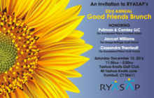 Join RYASAP as we celebrate our 23rd Annual Good Friends Brunch Saturday, December 10th, 11:30a-1:30p Tashua Knolls Golf Club & Banquets Brunch begins at 11:30a Program & Award Ceremony begins at Noon