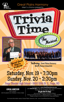 "Trivia Time--the Musical", featuring Steve Poitras, MC of the popular KFGO program Trivia Time. This fun-filled shows sets the drama of trivia, to music with some of your favorite songs performed by Great Plains Harmony. Come for the music and to participate in this interactive, audience participation friendly musical an trivial extravaganza!