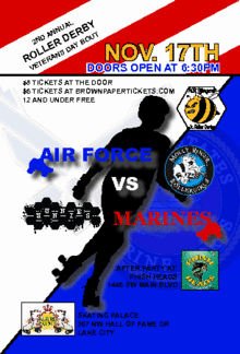 Join the Hunnies for the 2nd Annual Veterans Day Bout, Air Force vs Marines at the Skating Palace in Lake City as we mix with the Molly Rogers Rollergirls! Tickets will be $5 from Brownpapertickets.com, $8 at the door, and kids 12 years and under get in free. Doors open at 6:30pm, bout starts at 7:00pm. Arrive early for best seating or purchase a $2 upgrade to a comfy chair located in the turns, where the best action happens! Roller derby is generally considered PG-13. Assorted snacks and non-alchoholic sold at the concession stand. Join us afterwards for a free afterparty at Phishheads!