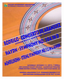 The Valley Symphony Orchestra, under the direction of Michael H. Arshagouni, continues its' tradition of high-quality, low-cost classical music with this very special concert featuring two monuments of music: Rodrigo's evocative and popular Concierto de Aranjuez for guitar and Haydn's final statement on symphonic music with his Symphony No.104 in D.