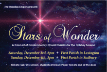 Halalisa's winter concert Stars of Wonder shimmers with gorgeous choral music selections including Ola Gjeilos Northern Lights, Eric Whitacres Glow, Stars by Erik Esenvalds, Randall Thompsons classic Choose Something Like a Star, Morton Lauridsens Sure on This Shining Night, Rise Up Shepherd, and Follow by Andre Thomas, and the world premiere of Winter Stars, composed by Halalisas own accompanist Trevor Berens, and more.