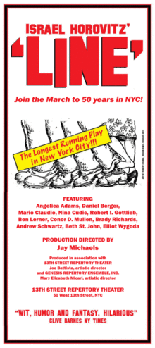 Next year will mark 50 years that Israel Horovitz's stunning surreal play, LINE, will have been performing in NYC. Beginning its life at Ellen Stewart's LaMaMa, ETC in 1967, the play moved to the 13th Street Repertory Theater in 1974 and has remained there ever since.
