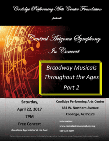 This will be the final concert for the season for the Central Arizona Symphony. Back in October 2016, the Symphony presented Part 1 of the Broadway Musicals Throughout the Ages and the journey continues. Come and enjoy the lively adventure into the past. The Symphony is under the guiding hand of Ms. Kimmy Calderone.