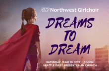 Dreams come to life in this all-out Northwest Girlchoir celebration! Our year-end concert features inspiring texts from Langston Hughes, Lewis Caroll, and Mark Twain, songs from musicals like The Wiz and Oklahoma, soaring new works by Karen Linford Robinson and Joan Szymko, and Oscar Petersons enduring Hymn to Freedom. Graduating seniors will also share their "senior song" on their way to their next life adventures!
