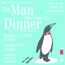 Laguna Beach High School Park Avenue Players present their Fall Production of THE MAN WHO CAME TO DINNER, penned by the renowned duo, Kaufman and Hart! This brilliantly witty and impulsive play succeeds in combining the sophistication of great comedic literature, the frenetic energy of a silly farce, and genuinely sweet attraction into one of the most beloved comedies of American theatre. Filled with 30+ fascinating characters winking homage to popular 1930s celebrities such as Alexander Woollcott, Harpo Marx, Noël Coward and Gertrude Lawrence, this play is both a wonderful period piece and timeless comedy classic.
