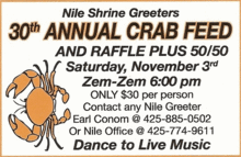 Nile Shrine Greeters Annual Crab Feed and Raffle Saturday, November 3, 2012. Cocktails at 6:00 pm, Crab Feed and raffle to follow. Dance the evening away to live Music. Open to the public.