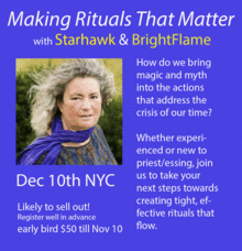 We aim to keep advance registration prices low. For lowest advance price, register by Nov 10th. Regular advance price is available (if tickets remain) through noon on Dec 9th. Prices will be $10 higher at the door ($70), subject to availability. ***NOW SOLD OUT*** We sold out in advance the last 2 times. Net of venue costs, all funds go to Starhawk for her work creating a just, sustainable world. We are unable to offer refunds on registration.