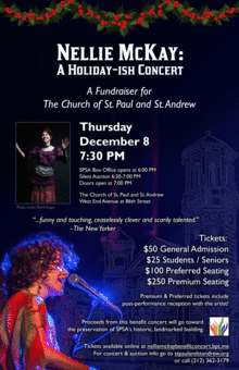 Nellie contributed the forward to the 20th anniversary edition of The Sexual Politics of Meat, by Carol J. Adams. Her writing has also appeared in The Onion, Interview and The New York Times Book Review. Nellie will be sprinkling some holiday songs throughout her repertoire as a way to welcome the season and help raise funds for the preservation of St. Paul and St. Andrew's United Methodist Church's historic, landmarked building. There will be a silent auction from 6:30 - 7:00 pm. Check the church's Web site at http://stpaulandstandrew.org for an advance view of items as they come in.