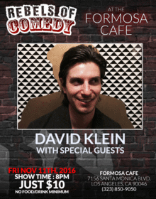 It's Rebels of Comedy at the Formosa Cafe in West Hollywood. Come out and see a night of live comedy, featuring an awesome lineup of professional features and headliner comedians.