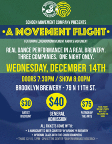 Schoen Movement Company presents an evening of dance performance at the iconic Brooklyn Brewery, featuring uber-talented guest companies: LoudHoundMovement and B.S Movement. Come see sophisticated, exciting works of art while mingling and drinking beer brewed on site. This is where dance performance meets happy hour. A Pop-Up food vendor will round out the evening.