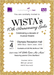 The West Island Theatre Association would be honoured by your presence at WISTA's 10th Anniversary Gala! Thanks to each and every one of you, we've made it to this incredible milestone and we are overjoyed at the opportunity to celebrate our shared achievements and successes together!