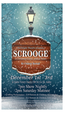 SCROOGE A Christmas Carol... with a Twist! by Charles Dickens, adapted by Chelsea Restall Directed by Lizzy Evashkevich December 1st-3rd, 2016 Everyone knows Ebenezer Scrooge, but what about Eliza Scrooge? A mean-spirited, miserly old maid named Eliza Scrooge sits tightly locked in her old home, saying "Bah Humbug" to Christmas. Can the visit from the most unexpected guest thaw her frozen heart? Or will the most unfortunate future still befall her? This classic tale of second chances, with a twist, is sure to warm your heart this Christmas Season.