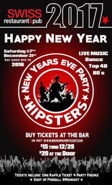 Ring in 2017 with an experience you'll remember all year long. The Swiss presents THE HIPSTERS they play nothing but solid ground pounding, hip grinding, ass shaking rock and roll.Solid dance rock that you know and love...High energy atmosphere that you want to be a part of...its hot rock for cool people, and you need to get some. Fireball toast @ midnight & drink specials all night long. When you arrive you'll be given raffle ticket. PRIZES (I mean good prizes like a Jack Daniels Guitar)on the hour starting at 9pm till 1am