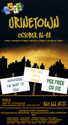 URINETOWN is written by Greg Kotis, with music by Mark Hollmann, and lyrics by Hollmann and Kotis, and will be directed by NCTC Alum, CHRISTA PIZZOFERRATO, choreographed by NCTC Alum, JESSIE SATTLER, and musically directed by SARAH LAURENZANO. Performances are October 26-28, Friday and Saturday at 7:00pm, Saturday at 2:00pm and Sunday at 1:30pm. Please note that online ticket sales have ended for Friday, October 26. Please call the Box Office at 860.666.NCTC to check availability. Thanks