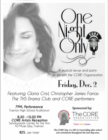 The CORE Org. is Creative Outreach Reinventing Expression- Our motto: Think. Feel. Create. We are a source and resource 501(c)3, providing arts enrichment and wellness programs throughout the east bay area. Through our team of professional teaching artists and programs in both the fine arts and performing arts we strive to work with all students and "consciously transform through the creative arts." This benefit is performance of songs and stories as well as a celebrate of student art work, films and vocal performances.