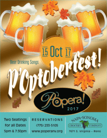 The last in our series of four will be POptoberfest on October 15, 2017. Featuring great drinking songs from Operas, Operettas, and your favorite Pubs. Raise your stein and celebrate along with POpera!