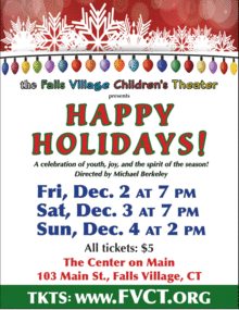 WE ARE AT CAPACITY AND ONLINE SALES HAVE ENDED! Join Michael Berkeley and a cast of 21 youth ages 8 - 18 as they perform seasonal favorites in this popular and heart-warming musical revue! Tickets are $5 each and the three performances, Friday December 2 at 7 pm, Saturday December 3 at 7 pm and Sunday December 4 at 2 pm, are at the Center on Main, 103 Main Street, Falls Village, CT 06031. Don't delay! Limited Seating!