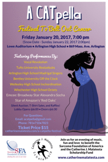 On January 20, 2017, at 7:00 p.m. in the Lowe Auditorium at Arlington High School, six spectacular local a cappella singing groups will assemble for a beautiful tribute and benefit concert, the A CATpella Festival to Belt Out Cancer. The event will honor the bright life and beautiful spirit of Catherine Malatesta of Arlington, Mass. who died in August 2015 from epithelioid sarcoma, an extremely rare form of cancer, after a courageous seven-month battle. The festival will benefit the Sarcoma Foundation of America and the Catherine J. Malatesta Scholarship Fund.