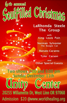 Be prepared to clap your hands, stomp your feet, and shout out loud at the 6th Annual Soul-Filled Christmas Concert, Sunday, December 11th. This year we will have 2 shows at 3pm and 6pm.