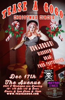 Come one! Come all! To the Greatest Holiday show in all of Lansing! We have an epic array of fabulous holiday circus performance in store for our lovely tease patrons! Including burlesque, sideshow, drag, boylesque, and more! Feel free to dress up and play along (circus, christmas, or both!) and partake in our free photo booth by Kendall D. Lartigue Photography