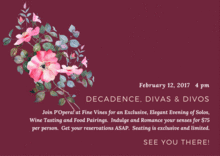 Our Salon Series continues with "Decadence - Divas & Divos" at the wonderful Fine Vines Wine Shop on February 12, 2017. The evening will include Wine Tastings/Food Pairings, in three courses with a wine sommelier selecting and discussing the wines. As a special bonus to attendees, Fine Vines is offering a 10% coupon for future visits, as well as a 15% discount on wine pre-orders of six bottles or more. Beautiful music sung by soloists from P'Opera! in an up-close-and-personal setting will be the entertainment. This lovely, intimate and exclusive event is $75 per person. Reservations required.