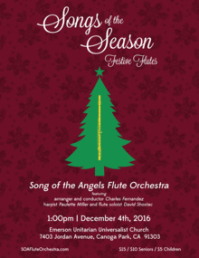 The next Song of the Angels Flute Orchestra concert in Los Angeles, "Songs of the Season - Festive Flutes", will be held on Sunday, December 4th at 1:00 p.m. at Emerson Unitarian Universalist Church, 7304 Jordan Ave., Canoga Park, CA 91303. Contact is Spike Dolomite Ward at 818-224-9091. Church directions: http://www.emersonuuc.org