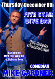 Mike Gardner is a rising young star on the comedy circuit! Gardner just released his second DVD Special Better Than a Real Job. His edgy autobiographical humor will take you on a roller coaster ride of subjects from his Redneck Mother and growing up with 6-sisters to his celebrity run-ins during his previous life as a prestigious country club golf pro. Youve seen him on MTV, FOX, WGN, and youve heard him on the nationally syndicated Bob & Tom Show, and Sirius XM Radio. Mike Gardners claim to fame came when he once gave Hootie (from the Blowfish) an HJ in a Dennys parking lot in Lubbock, TX for gas money and an autograph.