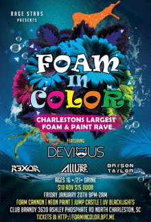 After over 500 people raging all night in foam & high reviews for our 1st debut foam rave we had to bring it back one more time & go even bigger. Now with the combination of some neon paint that will be added to the party with gallons of foam we know this is gonna be a wild night! Some of the best electronic artists in the state will be throwing down. Invite all your friends to the page & let's make this 1st combination for Charleston s largest foam rave insane!