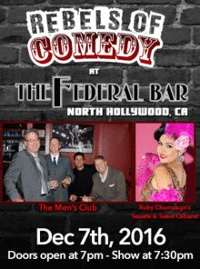 It's Rebels of Comedy at the Federal Bar in North Hollywood. Come out and see a night of live comedy, featuring an awesome lineup of professional features and headliner comedians.