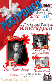 Show has been postponed to Dec 30th! Peaks and Pasties has put together one more night of tassels and assels for 2016. Let us raise a glass to the coming New Year. Well toast to the holidays with friends! We hope you will join us And join in our holiday cheer! What better way to celebrate than by unwrapping all we've got?!? Our very own Whiskey Darling's creative mind will be hitting the stage for 2 very special year end closing numbers! We will have 2 amazing guest performers to lead us though a Fun Filled Burlesque- with a Holiday Show! One Chance Fancy will be gracing the stage not once but twice, she will be showing her classy and sassy sides!