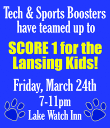 This year the Lansing Tech & Sports Boosters have teamed up to Score 1 for the kids! A new scoreboard and sound system are in the game plan. Following the huge success of our dance parties, we are bringing together outstanding local talent, and welcoming back some familiar faces from Lansing's storied athletic history. Our 20th annual fundraising event will be held on March 24th, 2017 at the Lake Watch Inn, from 7-11pm.